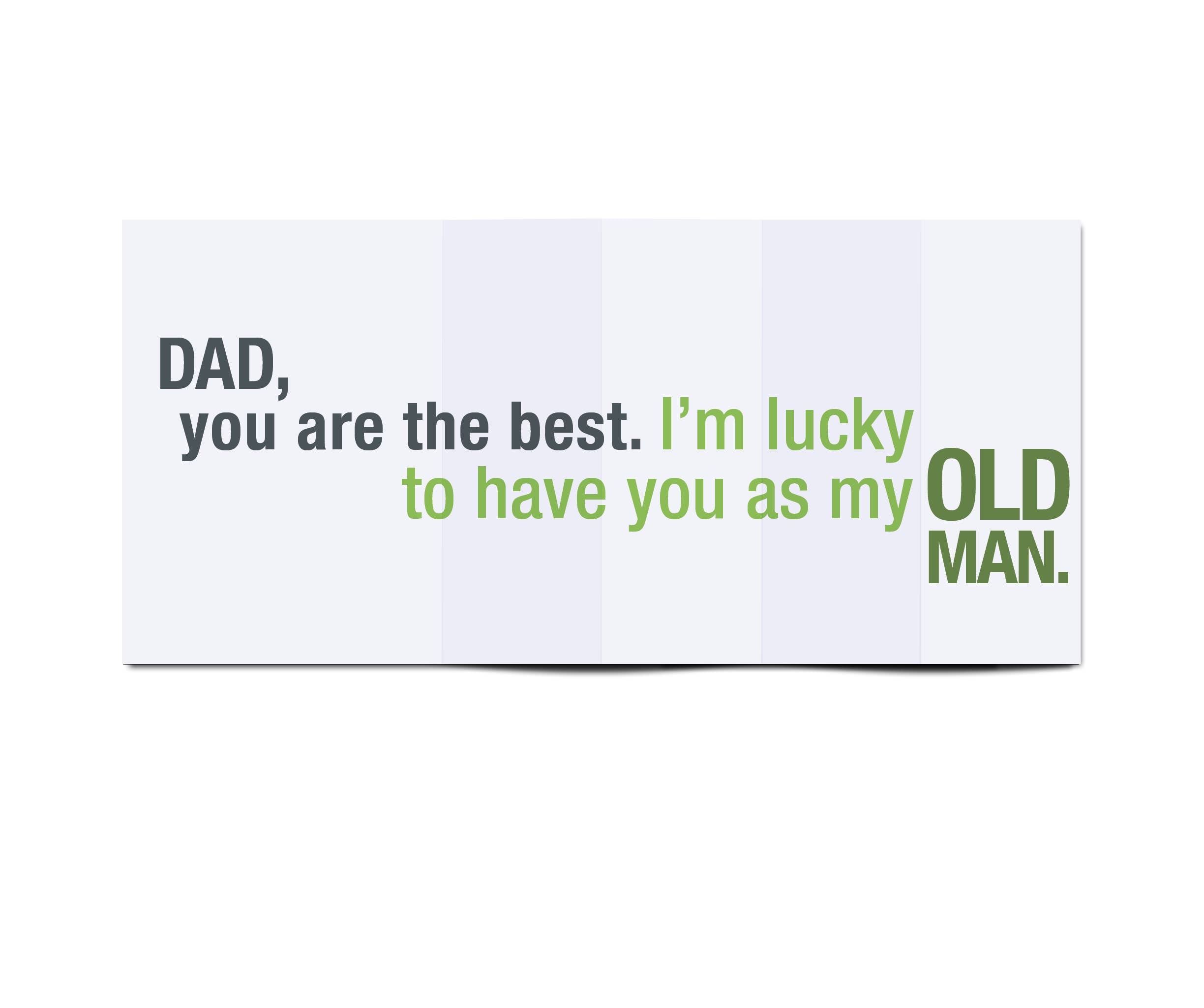 Opened: Dad, you are the best. I'm lucky to have you as my old man. • A6 sized (4.5" x 6.25") when closed. The right-side accordion fold opens to reveal a surprising message (open size is 13.5" x 6.25"). • Includes an envelope.